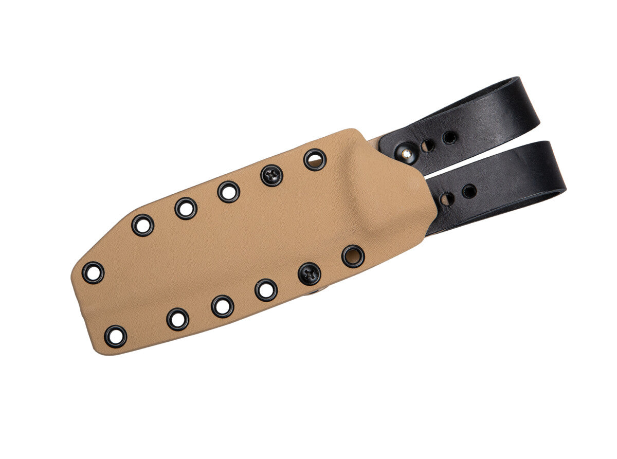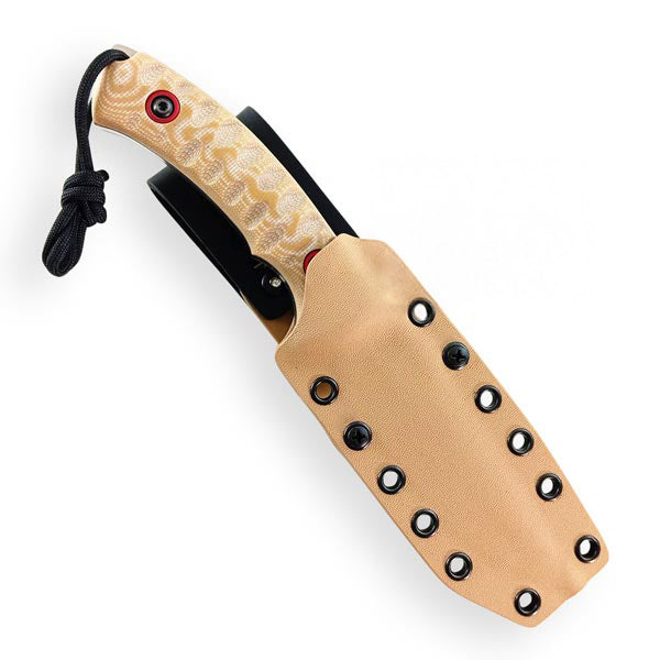 Håndtaket er laget i sandfarget micarta med svart spacer, som gir både et unikt utseende og et trygt, komfortabelt grep under alle forhold. Den leveres med en multipositions Kydex-slire i sandfarge, utstyrt med avtagbare stropper for fleksibel bæring på belte eller utstyr.